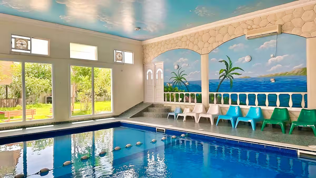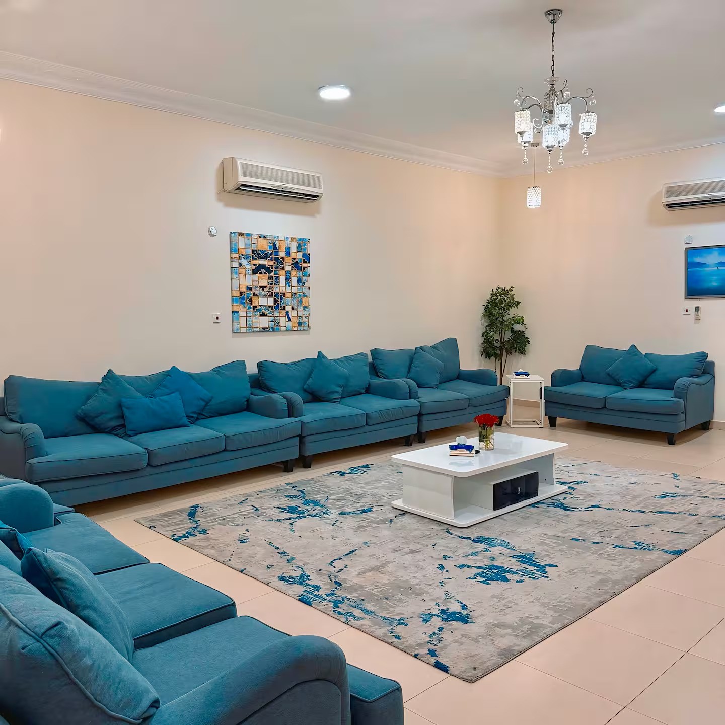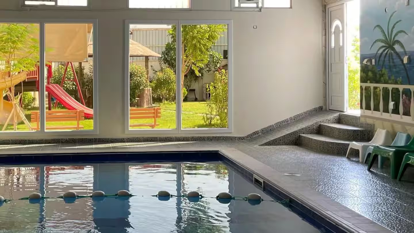 This villa offers 4 bedrooms, a spacious living area, a private indoor pool, and a separate kids room. Outside, you’ll find a garden with a gazebo, a BBQ area, a playground, and a majlis for relaxing and talking. There’s also a billiards table for fun with family and friends. A calm, comfortable space made for easy gatherings.