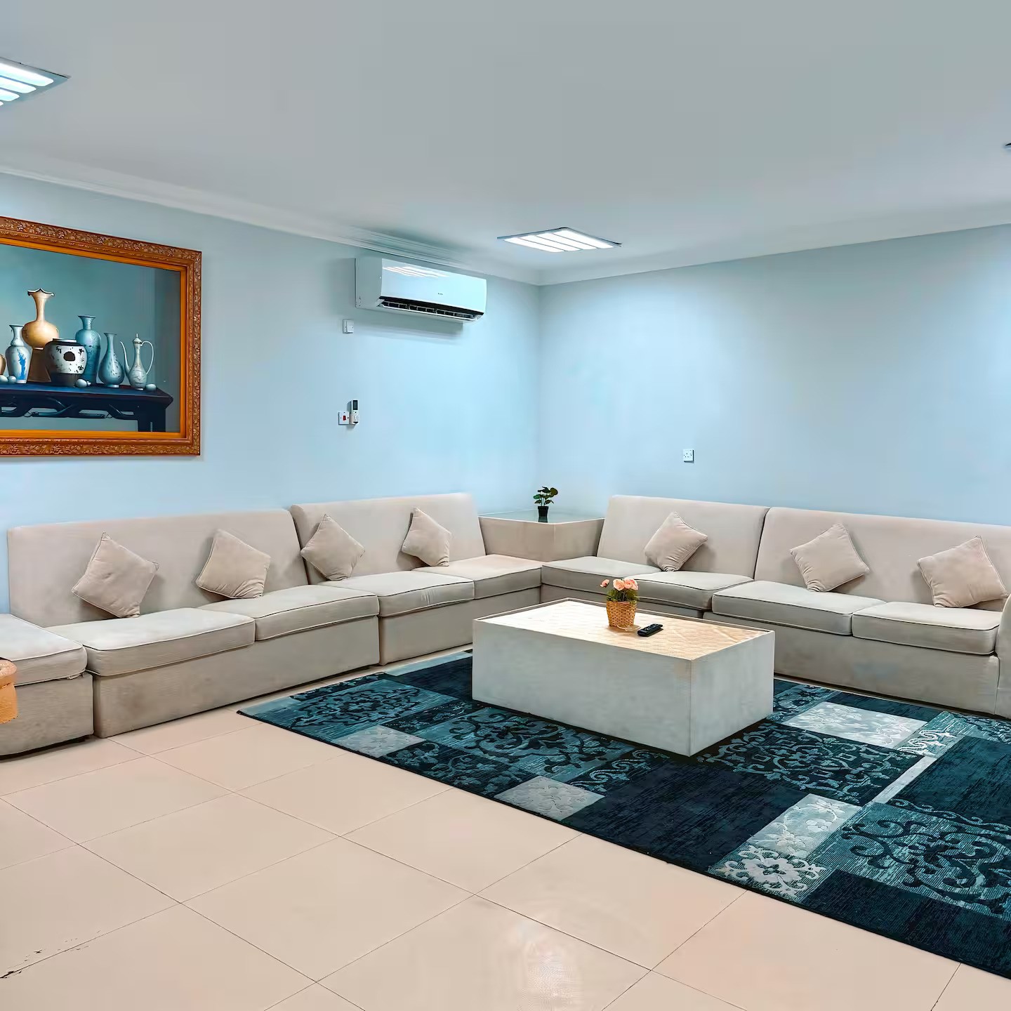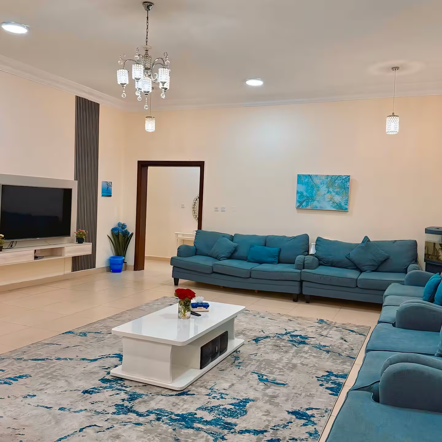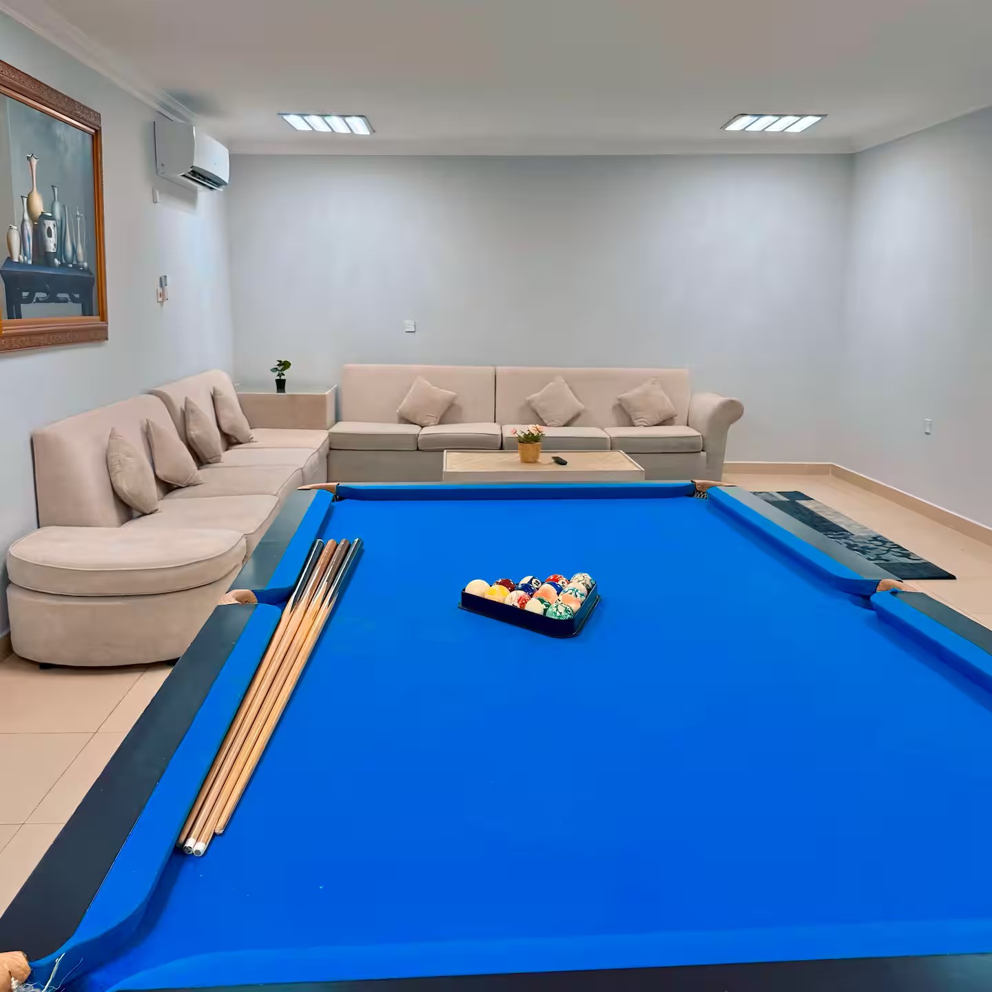 This villa offers 4 bedrooms, a spacious living area, a private indoor pool, and a separate kids room. Outside, you’ll find a garden with a gazebo, a BBQ area, a playground, and a majlis for relaxing and talking. There’s also a billiards table for fun with family and friends. A calm, comfortable space made for easy gatherings.